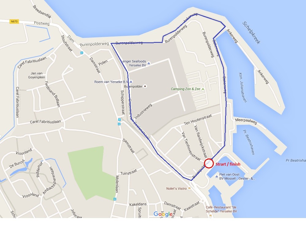 Parkoerslengte 2300 meter. Koers met bijzonder veel sfeer lang de oever van de Oosterschelde en over de visserhaven......