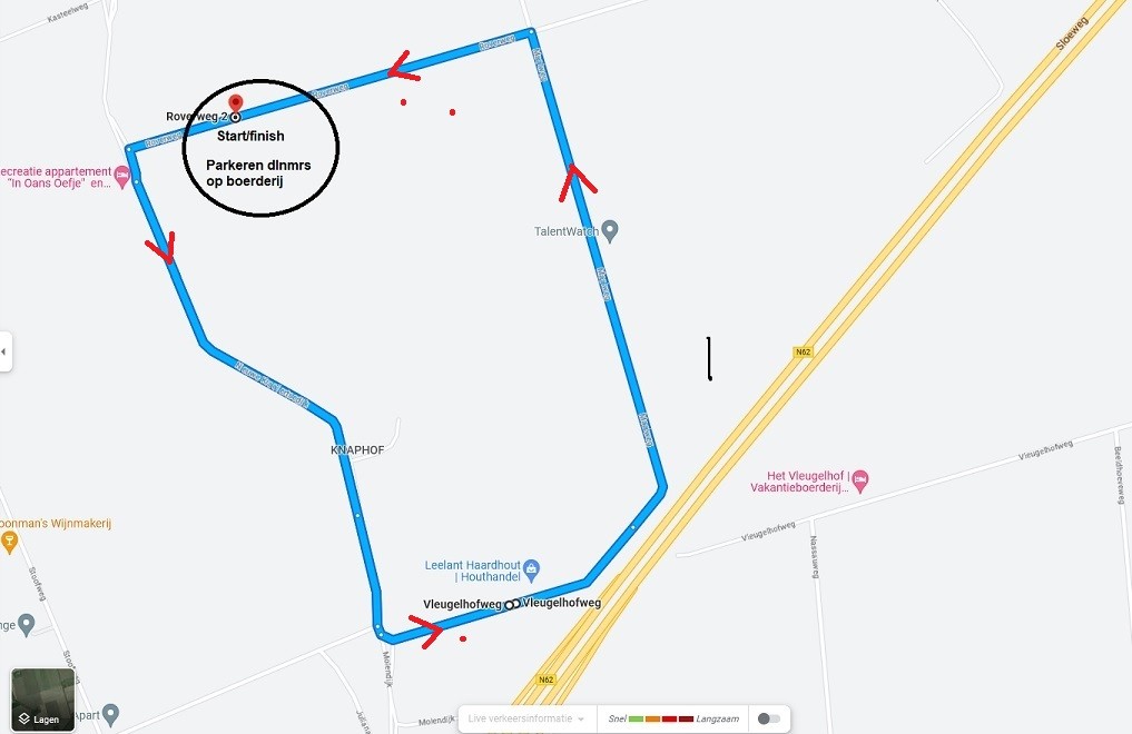Permanence Roverweg 2 (tevens parkeerplek voor auto's renners op boerderijterrein; NIET aankomen en vertrekken tijdens de wedstrijden)