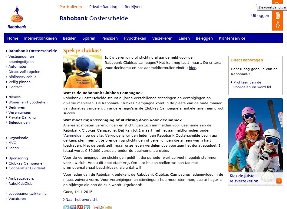Rabobank Oosterschelde heeft haar sponsorbeleid gewijzigd. Nu bepalen de leden van de bank welke organisaties een financiële bijdrage krijgen. Hiervoor is een totaalbedrag van € 80.000,-- beschikbaar. Rabobank Oosterschelde omvat alle RABO’s van Zuid-Beveland, Schouwen-Duiveland en Tholen.