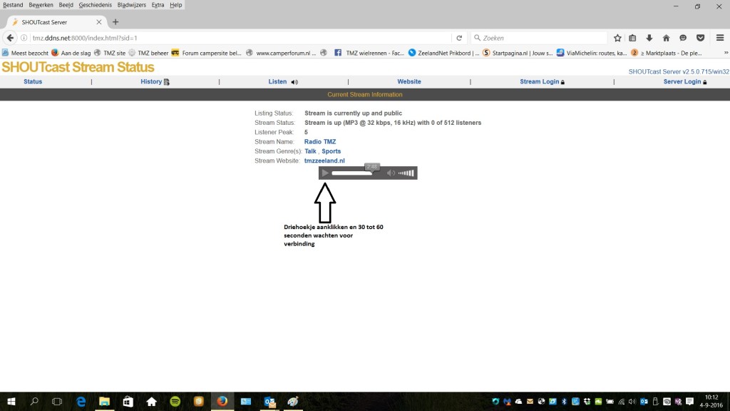 Toets in de browserbalk: tmz.ddns.net:8000 (geen www. oid) en U ziet een scherm met TMZ radio. Klik op het driehoekje voor de geluidbalk en na 30 a 60 seconden bent U live.