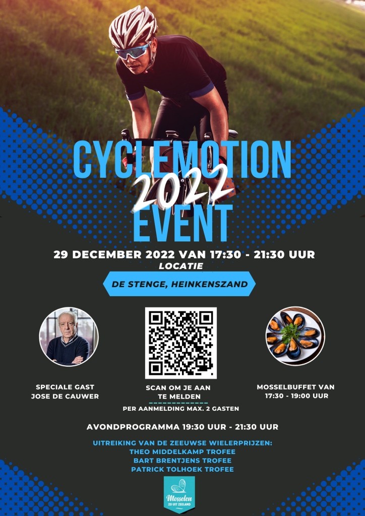 Vanaf 17.30u inloop en gratis mosselbuffet..... Avondprogramma vanaf ca 19.30u met oa José de Cauwer als gast + huldiging van de beste Zeeuwse renner/renster, beste Zeeuwse ATB-er/veldrijder en de Vrijwilliger van het Jaar.