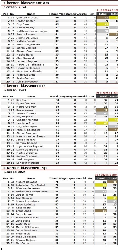 Voor het 4 Kernen-Klassement dien je aan minimaal 3 van de 4 wedstrijden te hebben deelgenomen (bij 4 deelnames tellen wel alle punten mee);